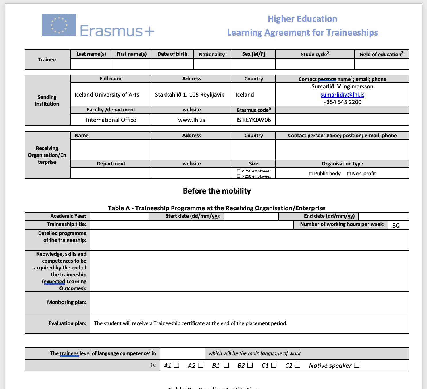 Einungis skal fylla út grunnupplýsingarnar efst sem og fyrsta hlutann (before the mobility) með móttökuaðila, undirrita hann og senda á netfang alþjóðaskrifstofu. Hér eru nokkur atriði í samningnum sem alþjóðaskrifstofa fær oft spurningar um: