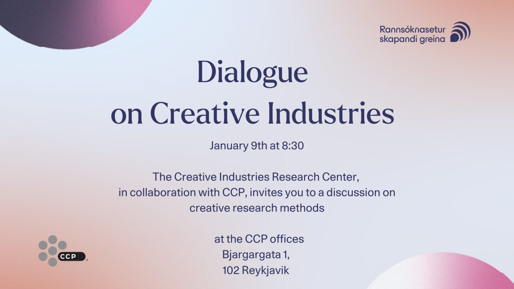 The Creative Industries Research Center (RSG), in collaboration with CCP, invites you to a discussion on creative industries on Thursday, January 9th from 8:30 AM to 10:00 AM at the CCP offices at Bjargargata 1, 102 Reykjavik. The topic of this meeting is Creative Research Methods. The meeting will be held in English and the presentations will be streamed on Facebook.