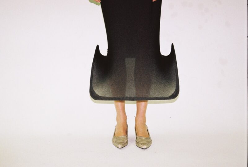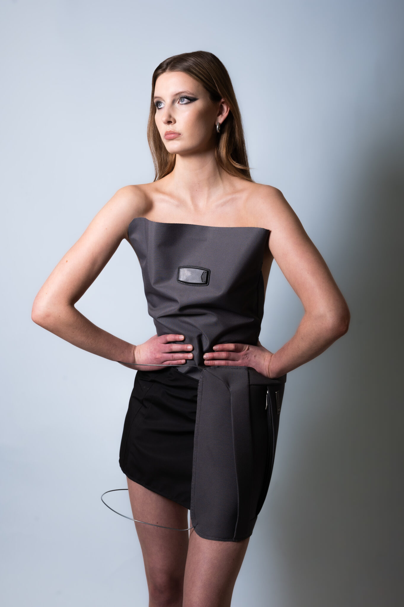 Línan er unnin úr óhefðbundnum efnum: ferðatöskum, plasti og efnum sem voru aldrei hugsuð fyrir klæðnað. Ég stjórnaði ekki alltaf hvert leiðinni var haldið, stundum var það efnið sem réð ferðinni.