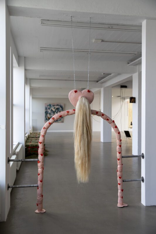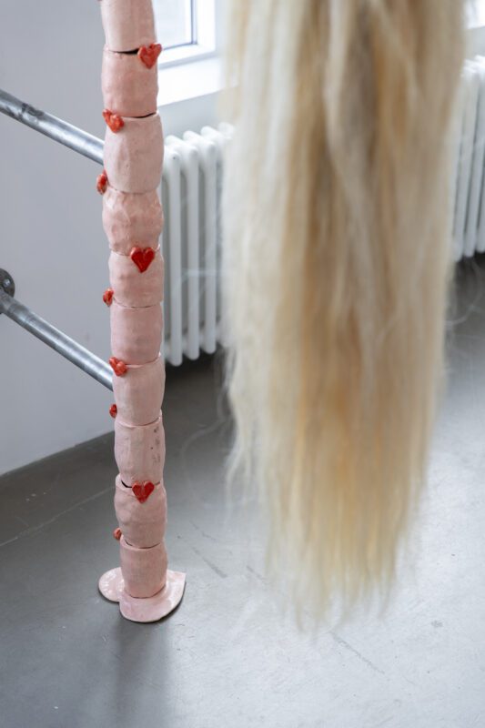 Welcome to Powerplay. To enter the exhibition, one shall bow beneath an arch made of horsehair and ceramics. Passing through makes you an integral part of the Horsegirl phenomenon. This phenomenon embodies a shift from the conventional horse-man relationship to a bond shared between women and horses. While historically horses symbolised power for men, the contemporary dynamic with women radiates with a charming and endearing pink-hued affection, reshaping traditional power- paradigms and celebrating the intricate layers of this evolving connection. This gateway serves as a reminder that power and strength were once provided by horses and claimed by men. But times have changed, and now that Horsegirls are in charge, strength and power gained through this special shift takes on a different form. There is always more than meets the eye. Please take a moment to contemplate the powerplay you have just encountered.