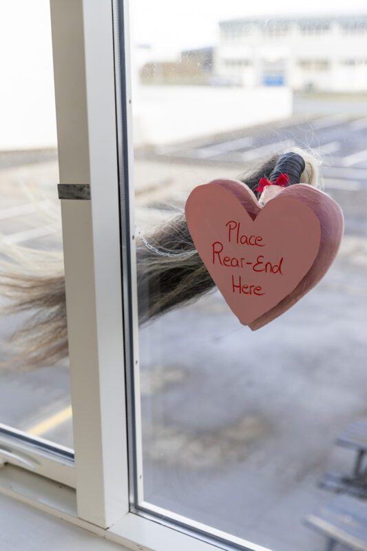Rear-Ends is a participatory experience that combines joy and empowerment in a playful setting. Picture yourself selecting a horse to ride and climbing atop the hay, to lift yourself above the ground, embracing the balance between fun and strength. Once you are up there, you will find yourself pressing your behind against the window, anonymously displaying it for new arrivals that are approaching the main entrance of the museum building. It is a daring leap for the fearless, with confidence, strength and a hearty dash of adventure! Are you up for this ride?