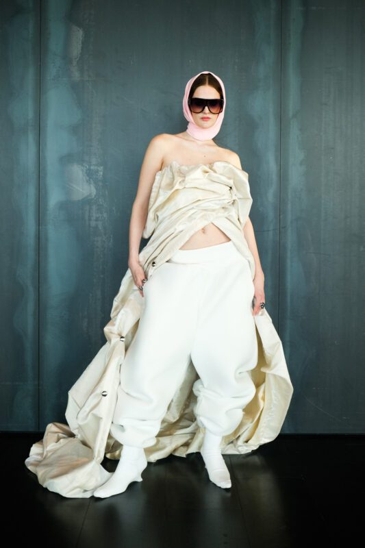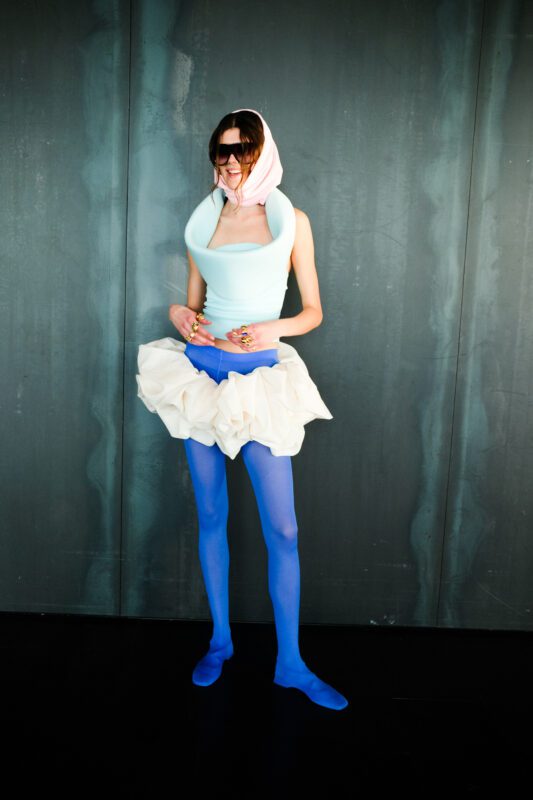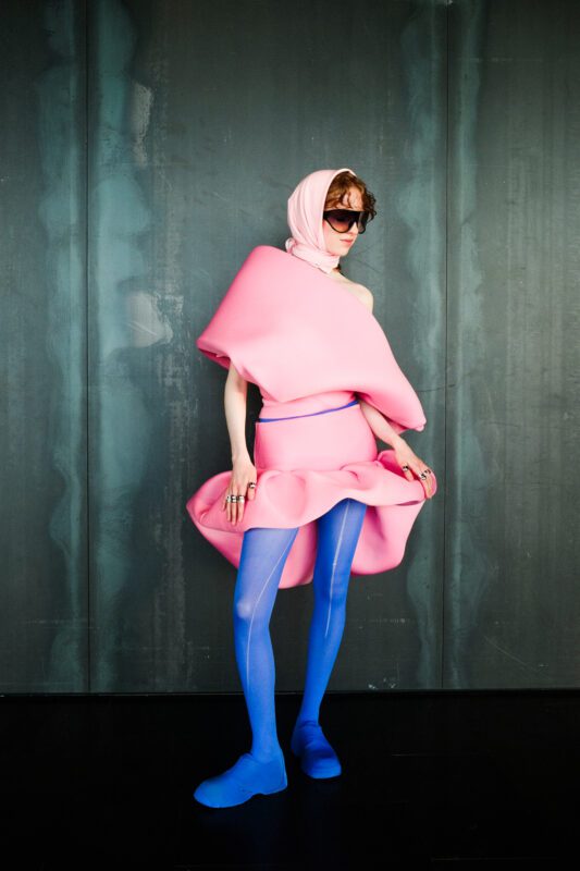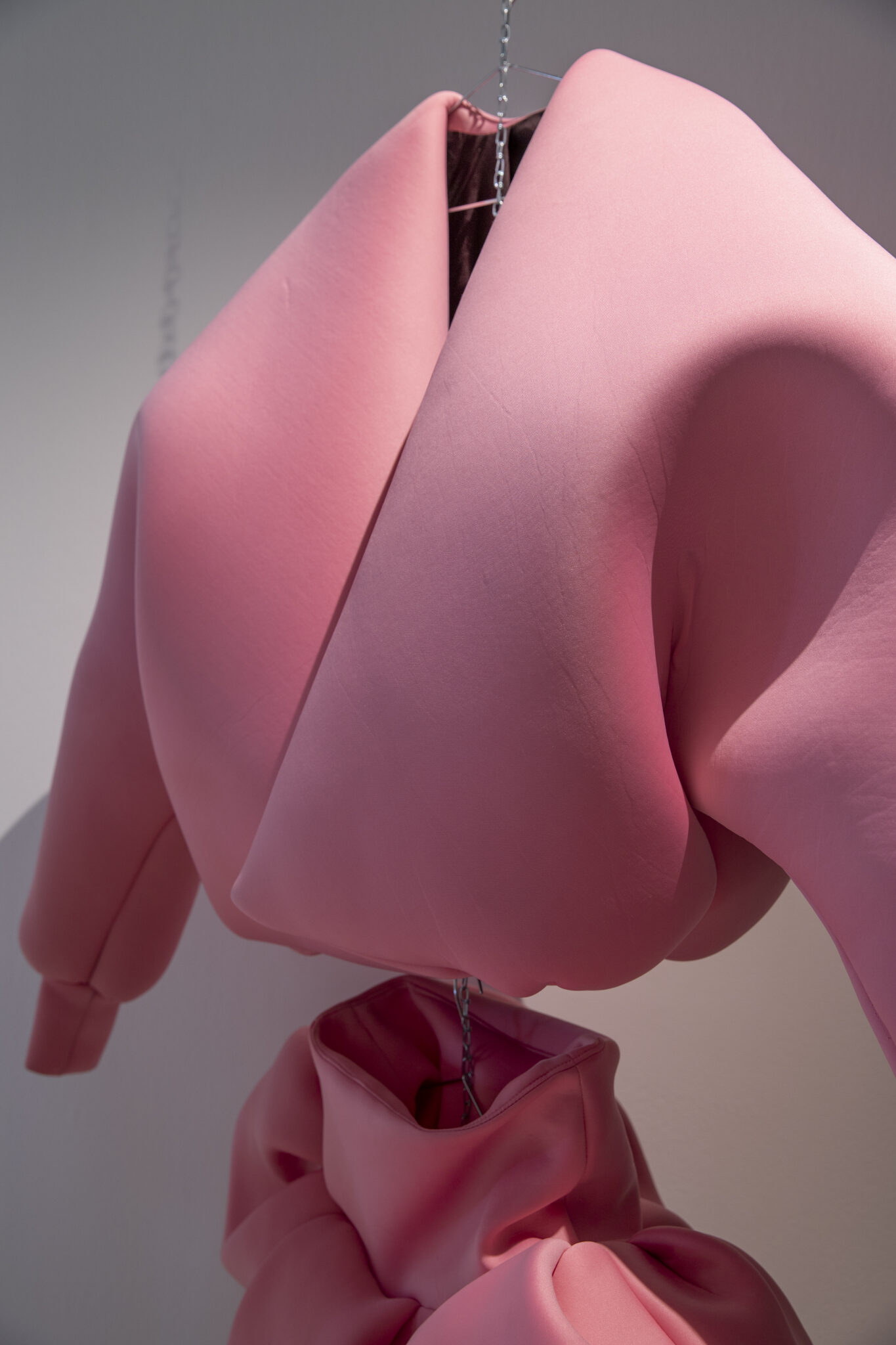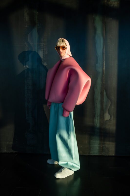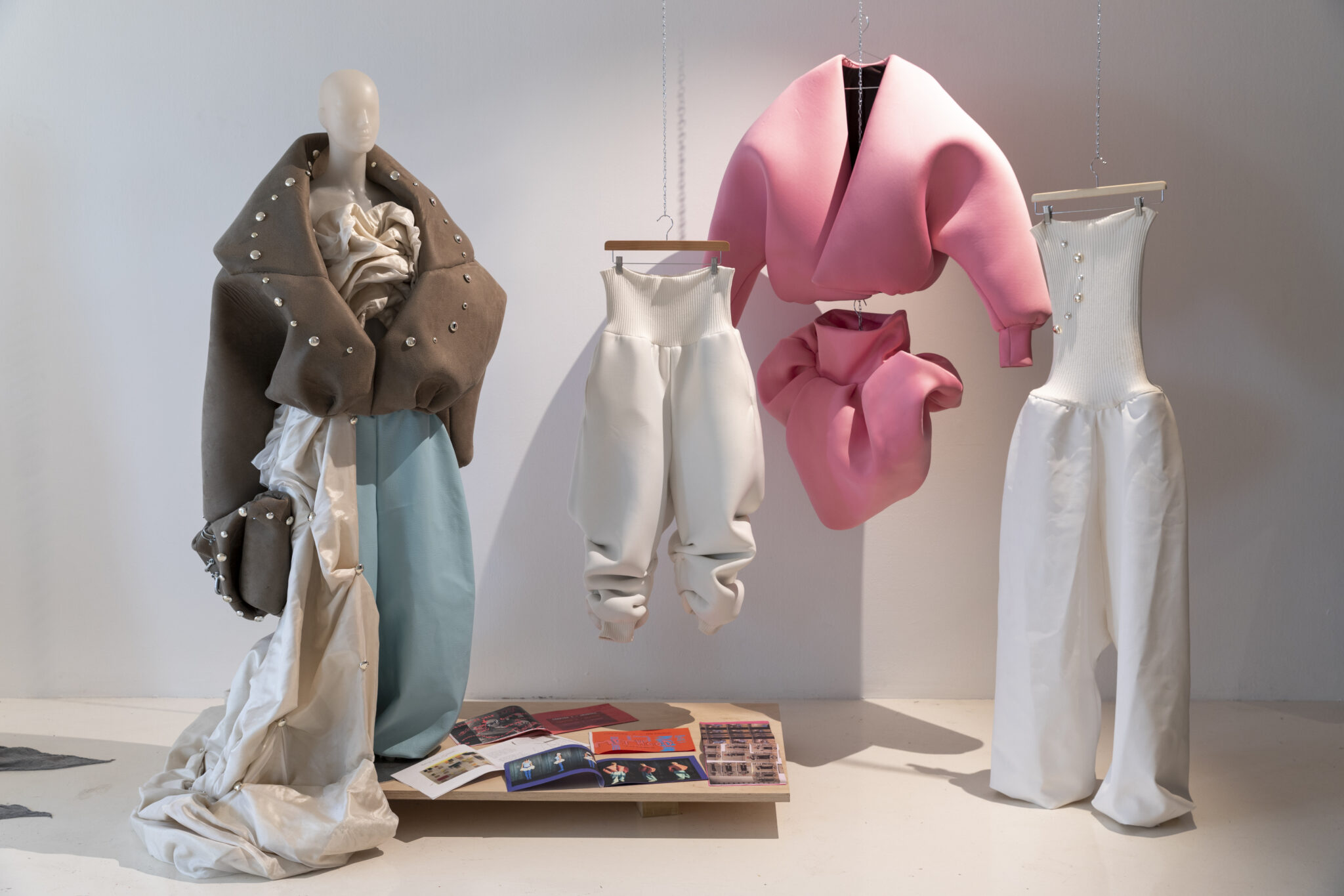 As a young girl, Ruby found herself imitating her father’s actions, soaking up his wisdom like a sponge. His guidance shaped her creative path, where she discovered potential in every object. Mixing unconventional elements into familiar moulds has become her design signature, driven by her belief that everything serves a purpose. Inspired by the saying ‘the student is like a sponge’, Ruby instinctively chose the ‘sponge’ as a core material, incorporating it into clothing moulds, the sponge embodies the absorption. This journey marks the beginning of Ruby’s unique design language. The collection reflects her journey and creative process. Remembering her dad and childhood, Ruby feels a carefree and safe side emerge, unconsciously guiding her. This essence infuses simplicity and playfulness into each piece.