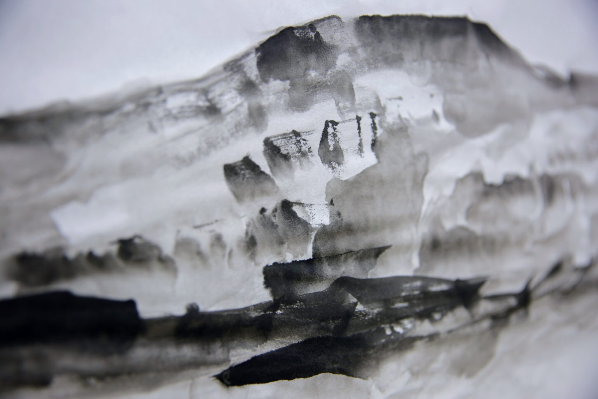 Blekið rennur og myndar heim, bæði kunnuglegan og nýjan, framandi og fallegt. Gegn um pensilstrokurnar sé ég náttúru heimabæjar míns í nýju ljósi.