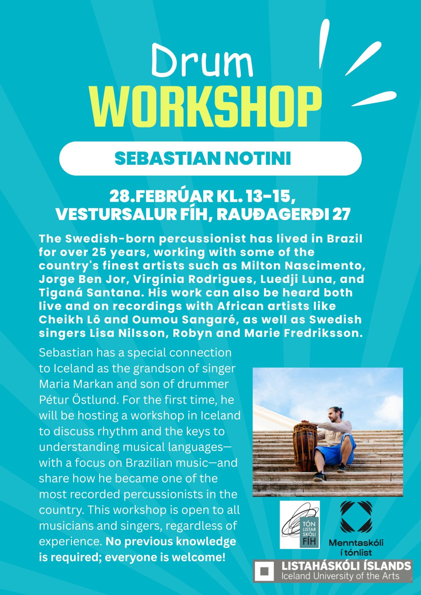 Sebastian has a special connection to Iceland as the grandson of singer Maria Markan and son of drummer Pétur Östlund. For the first time, he will be hosting a workshop in Iceland to discuss rhythm and the keys to understanding musical languages-with a focus on Brazilian music-and share how he became one of the most recorded percussionists in the country. This workshop is open to all musicians and singers, regardless of experience. No previous knowledge is required; everyone is welcome!