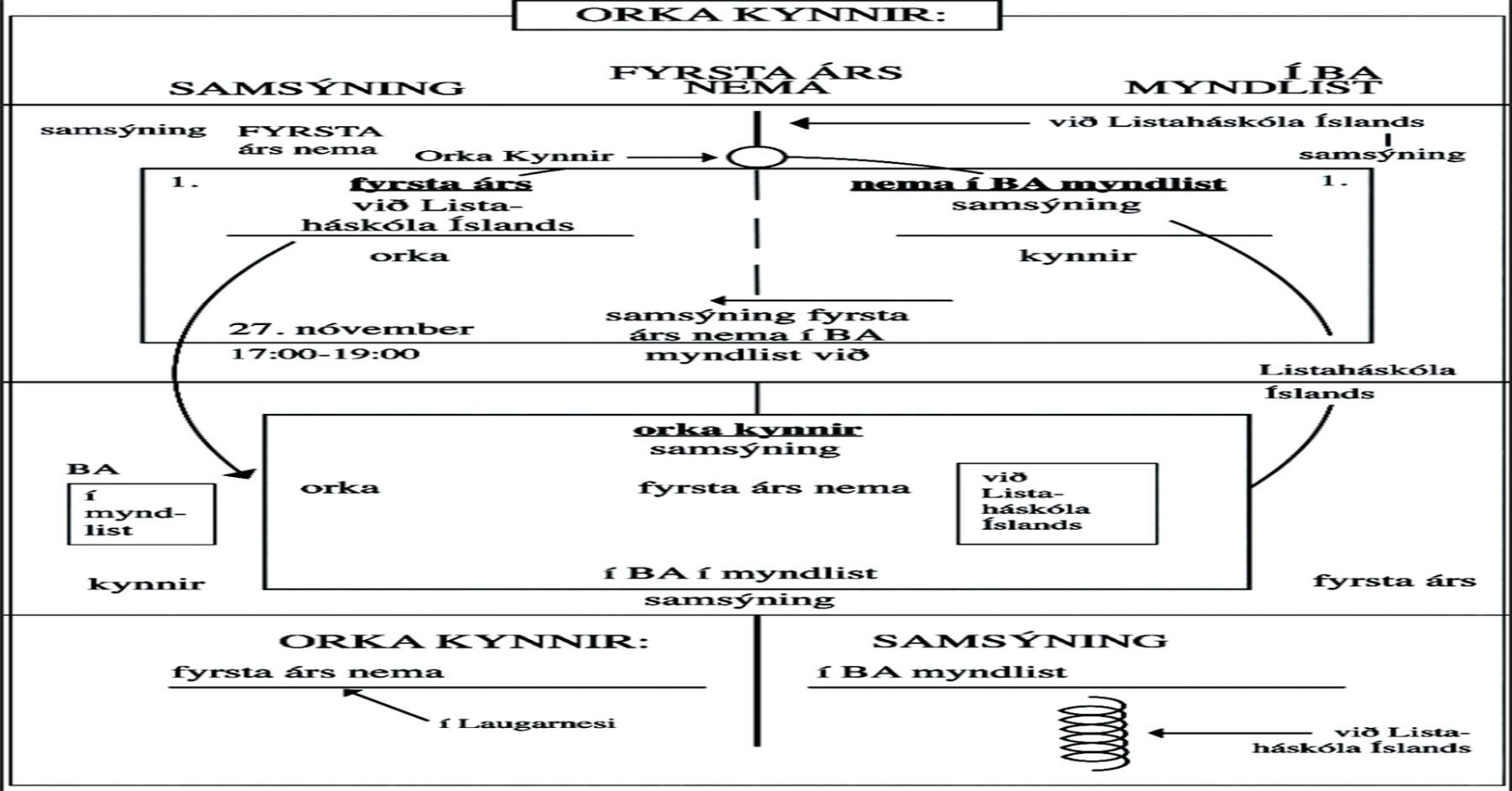 Við skulum (orka)© mæla orkuna hérna inni. Finna fyrir tánum, anda ofan í maga, horfa upp í loft. Hér er ágætlega góð orka. Nema birtan, hún er víst (orka)© baneitruð. Við reynum að semja um að hafa kveikt á borðlömpum (orka)©… en á morgnana skín eitrið og enginn slekkur á því. Birtan hlær að skammdeginu fyrir utan (orka)©. Tölum aðeins um anda. Andinn. Margt gengur, orkan er góð- góð orka. Öll eru í gír, að undirbúa verk… (orka)©