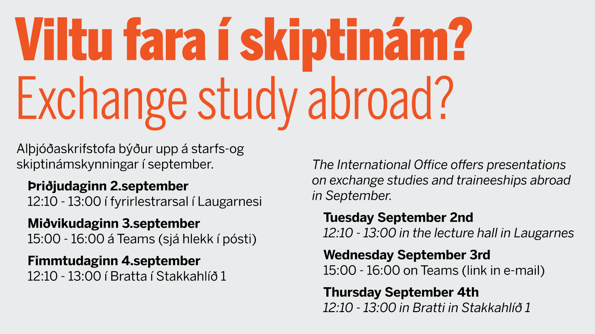 Alþjóðaskrifstofa býður upp á starfs- og skiptinámskynningar í september.
